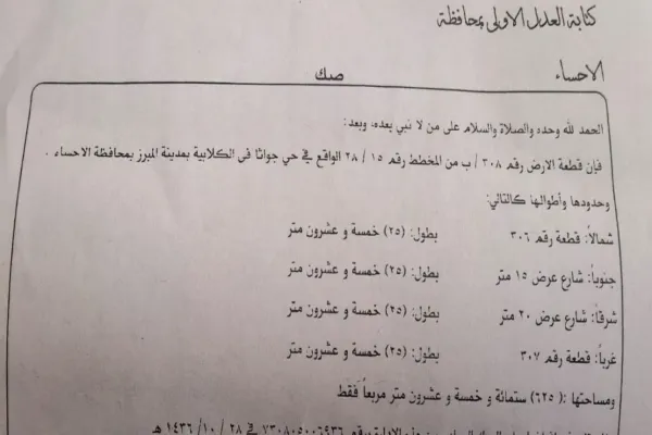 By bowheed February 11, 2026 العقار أرض التصنيف سكنية العقد للبيع وصف العقار ارض في مخطط جواثا ركنيه تتميز انها شرقيه جنوبيه سهلة الفرز ومناسبه للفرز حي جواثا رقم 308 باء المساحة 625 متر شارع 20 متر شرق شارع 15 متر جنوب الاطوال 25/25 متر سعر المتر 1550 ريال والصامل يبشر بعزه التفاوض قابل للتفاوض الوسطاء طرف